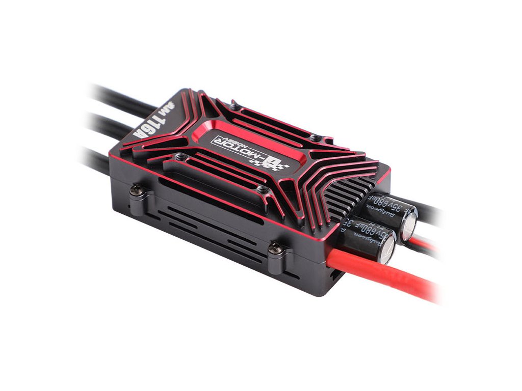 Špičkový regulátor T-Motor AM116A pro výkonné motory. Regulátor lze napájet 3-8S Lipo baterií a zvládne proud až 116A. Součástí regulátoru je i spínaný BEC s nastavitelným napětím 5,8, 7,4 nebo 8,2V a zatížitelností až 15A trvale (25A krátkodobě). Díky pokročilému firmware a 32bitovému procesoru zajištuje regulátor a přesnou odezvu plynu. Vhod přijdou i otvory pro snadné uchycení regulátoru pomocí stahovacích pásků. Součástí balení je i malý ventilátor, který je možné na regulátor uchytit pro aktivní chlazení.