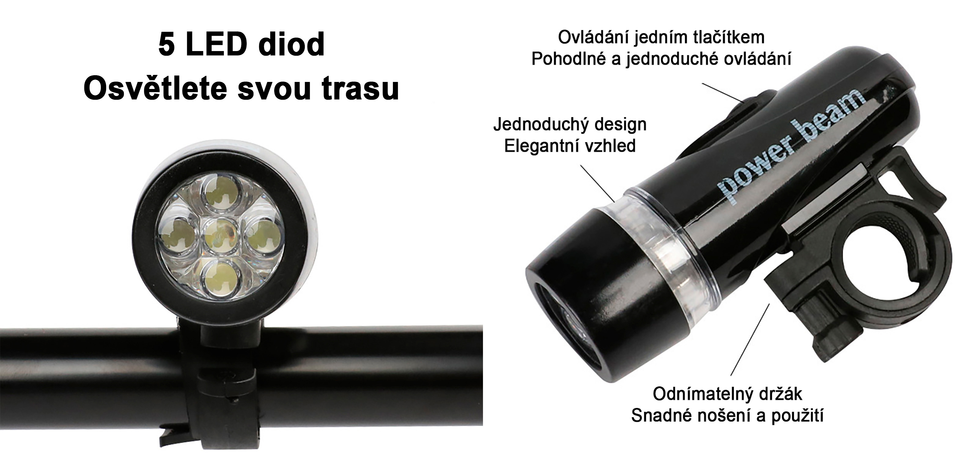 Přední světlo je osazeno 5 LED diodami, které zajišťují dostatečný jas pro osvětlení trasy. Konstrukce s jedním ovládacím tlačítkem umožňuje pohodlné a jednoduché zapnutí i vypnutí. Elegantní a kompaktní provedení působí moderně a zároveň prakticky. Odnímatelný držák usnadňuje manipulaci i přenášení.