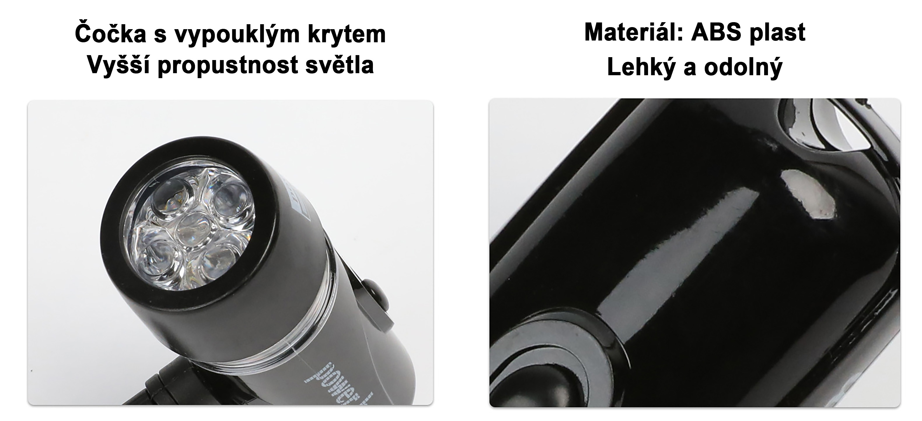 Přední část je vybavena konvexní čočkou s vyšší propustností světla pro efektivnější rozptyl paprsku. Tělo je vyrobeno z ABS plastu, který je lehký a zároveň odolný. Konstrukce je navržena s ohledem na běžné používání v terénu i městském provozu. Povrchové zpracování podporuje moderní a čistý vzhled.