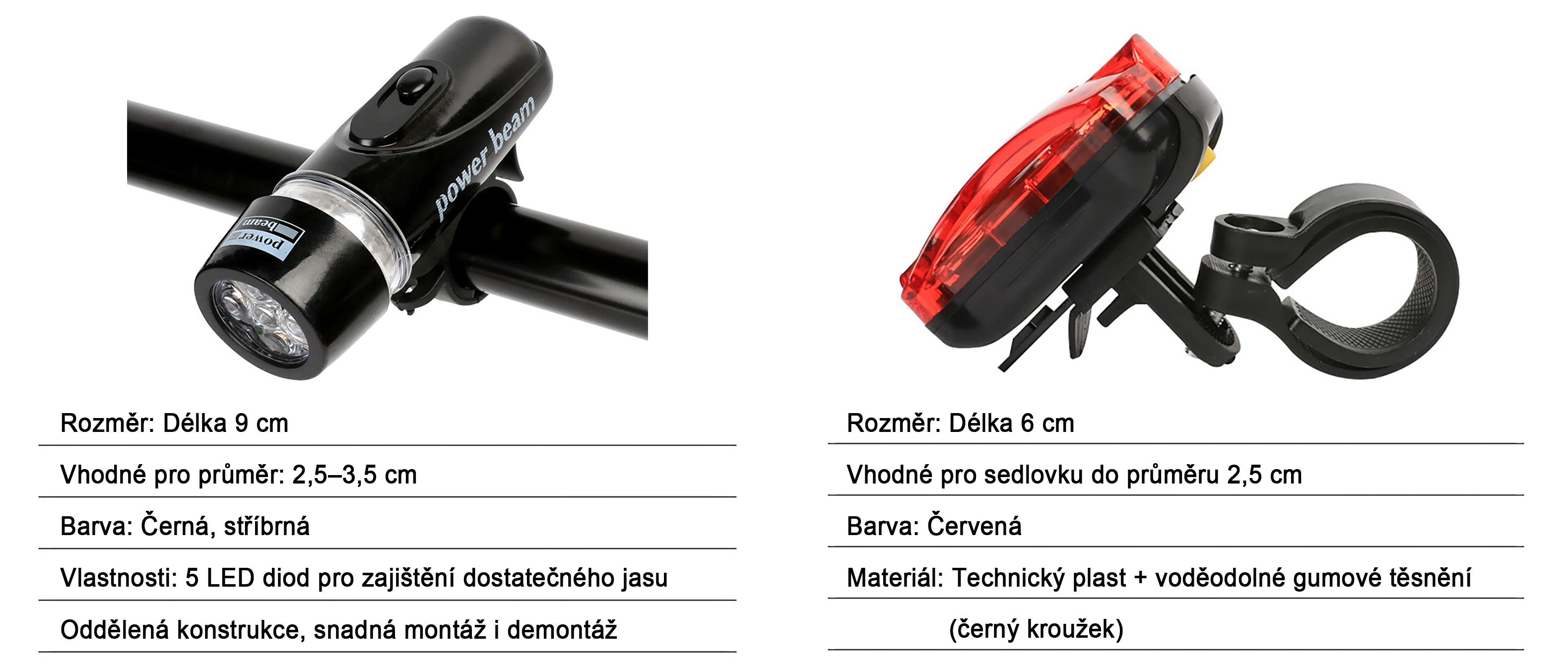Přední světlo má délku 9 cm a je vhodné pro řídítka o průměru 2,5–3,5 cm. Zadní světlo o délce 6 cm je určeno pro sedlovku do průměru 2,5 cm. Upevnění je rychlé a stabilní díky přiloženým držákům. Oddělená konstrukce umožňuje snadnou montáž i demontáž podle potřeby.