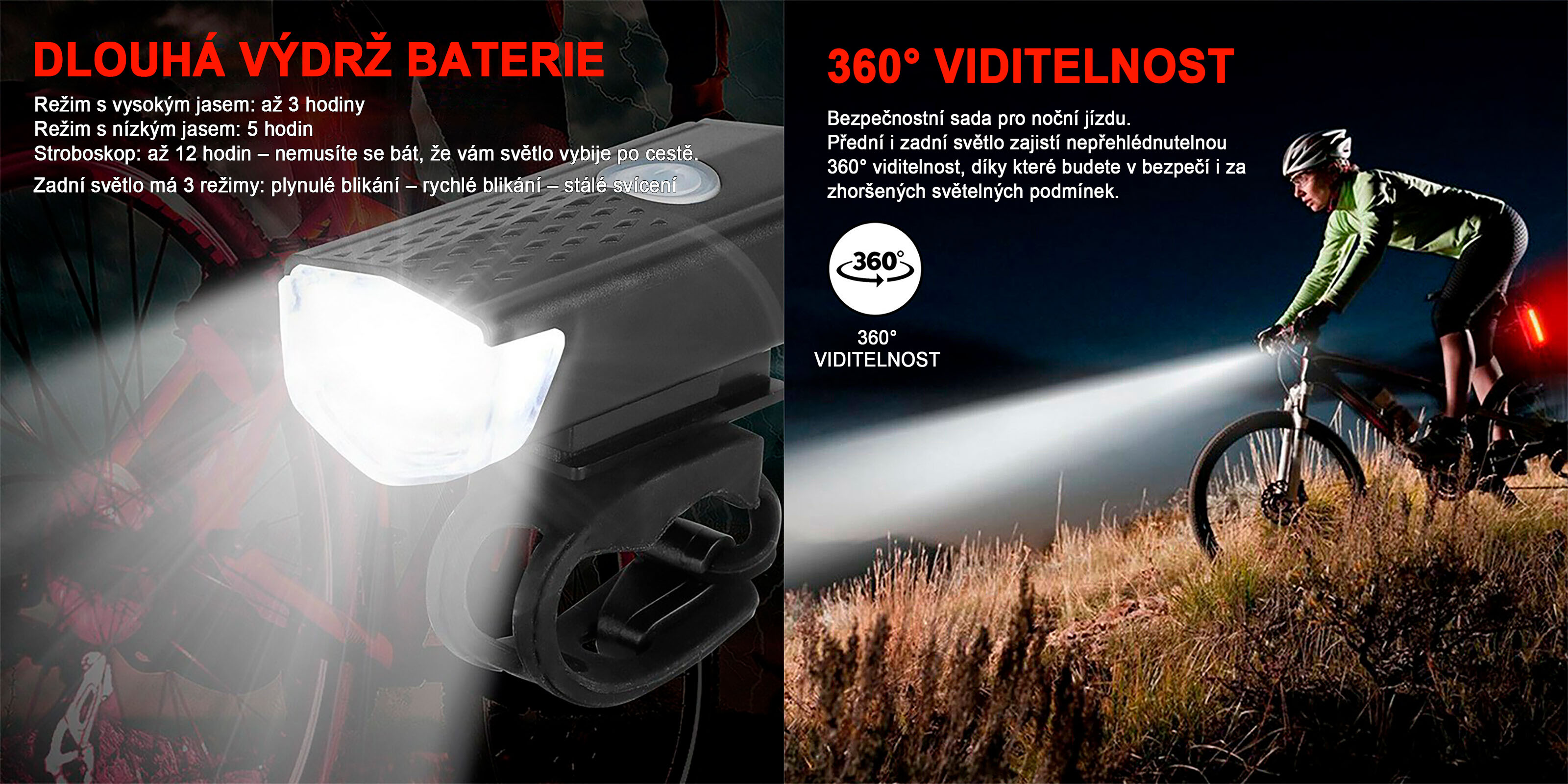 Vestavěná Li-ion baterie s USB nabíjením eliminuje nutnost výměny baterií. Krytí IP65 chrání světla před deštěm i prachem. Výdrž dosahuje až 12 hodin provozu dle zvoleného režimu.