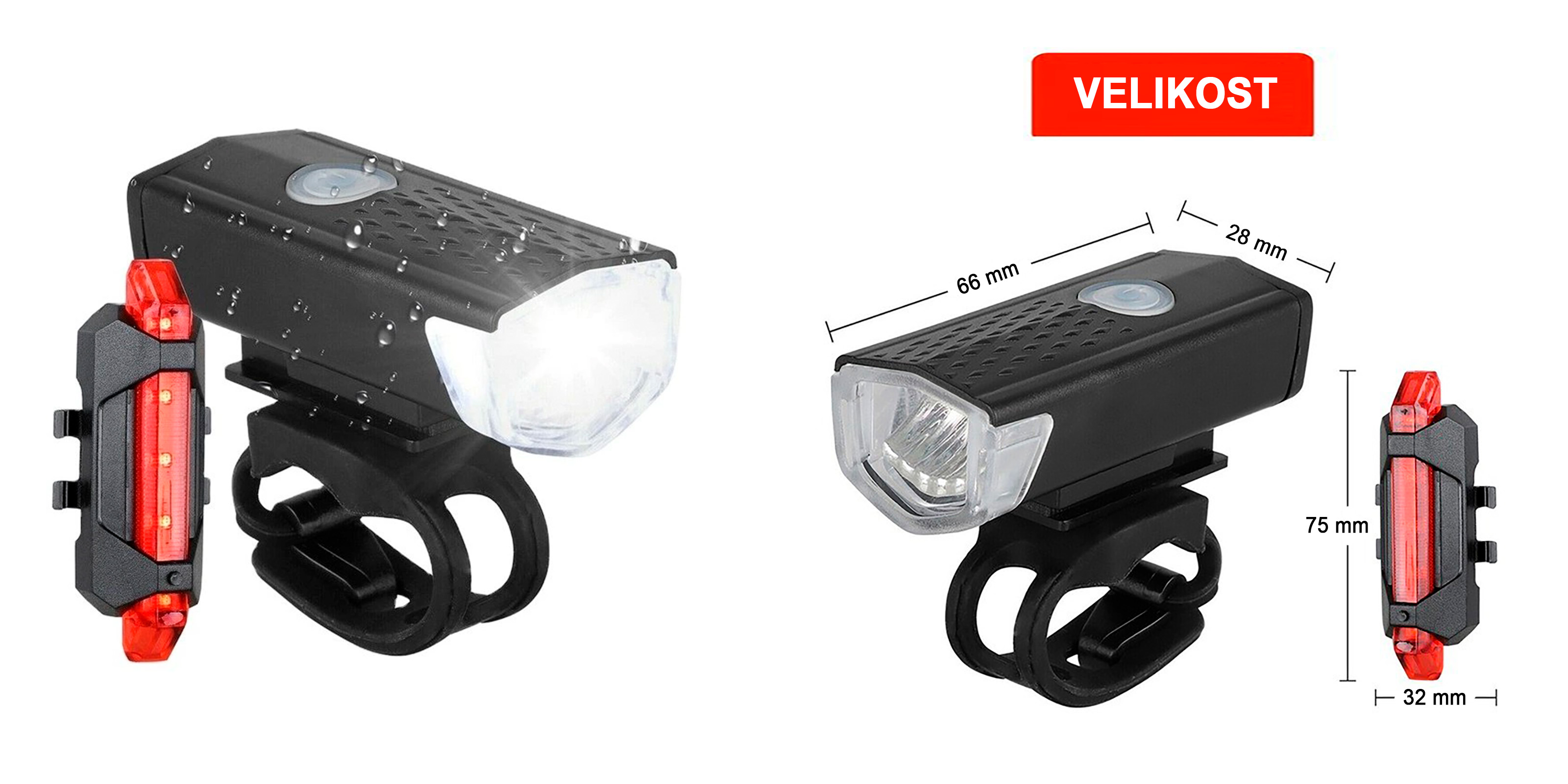 Sada zajišťuje 360° viditelnost, která výrazně zvyšuje bezpečnost při noční jízdě i za zhoršených podmínek. Přední světlo má rozměry 6,6 × 2,8 cm a zadní světlo 7,5 × 3,2 cm, což potvrzuje jejich kompaktní provedení. Díky kompaktní velikosti je instalace rychlá a jednoduchá. Konstrukce je navržena tak, aby poskytovala silné a efektivní osvětlení bez zbytečné zátěže.