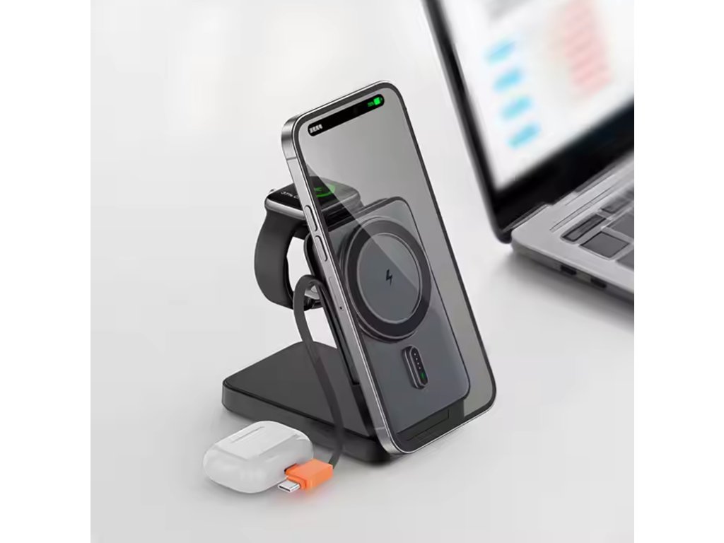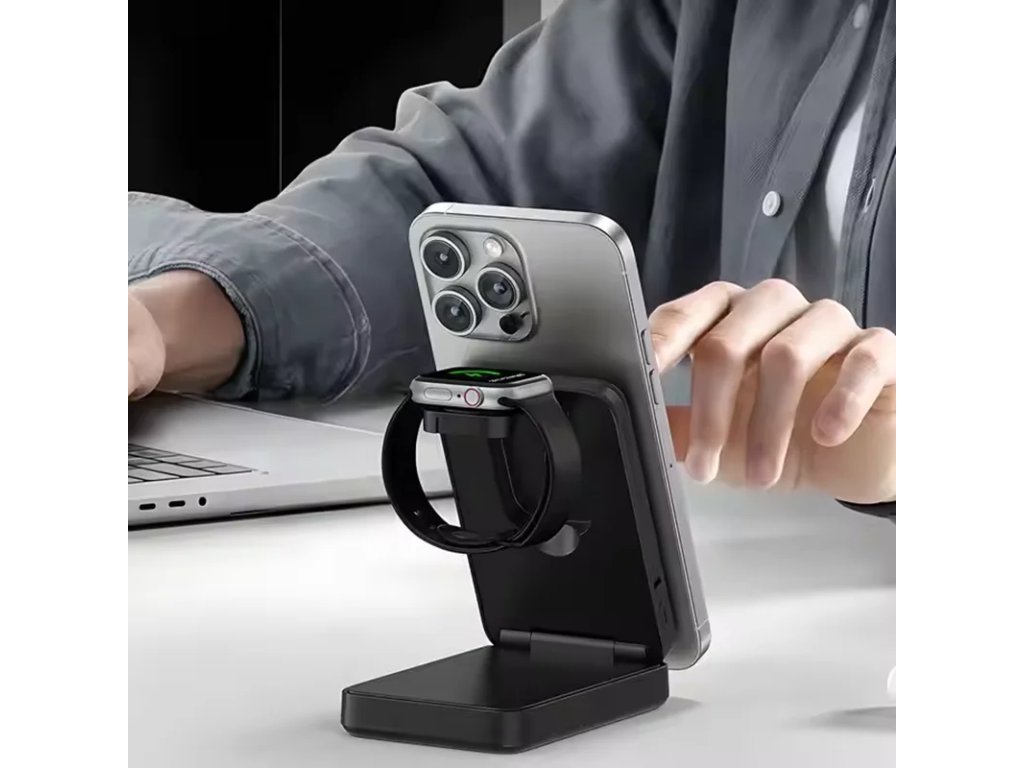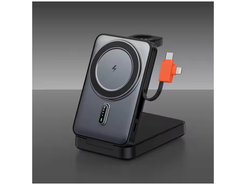 Skládací 3v1 magnetická bezdrátová nabíječka s kapacitou 10 000 mAh představuje praktické řešení pro uživatele, kteří potřebují nabíjet více zařízení současně, a to doma, v kanceláři i na cestách. Díky silnému magnetu je nabíječka kompatibilní s MagSafe modely iPhone a umožňuje jejich bezpečné a stabilní přichycení během nabíjení.