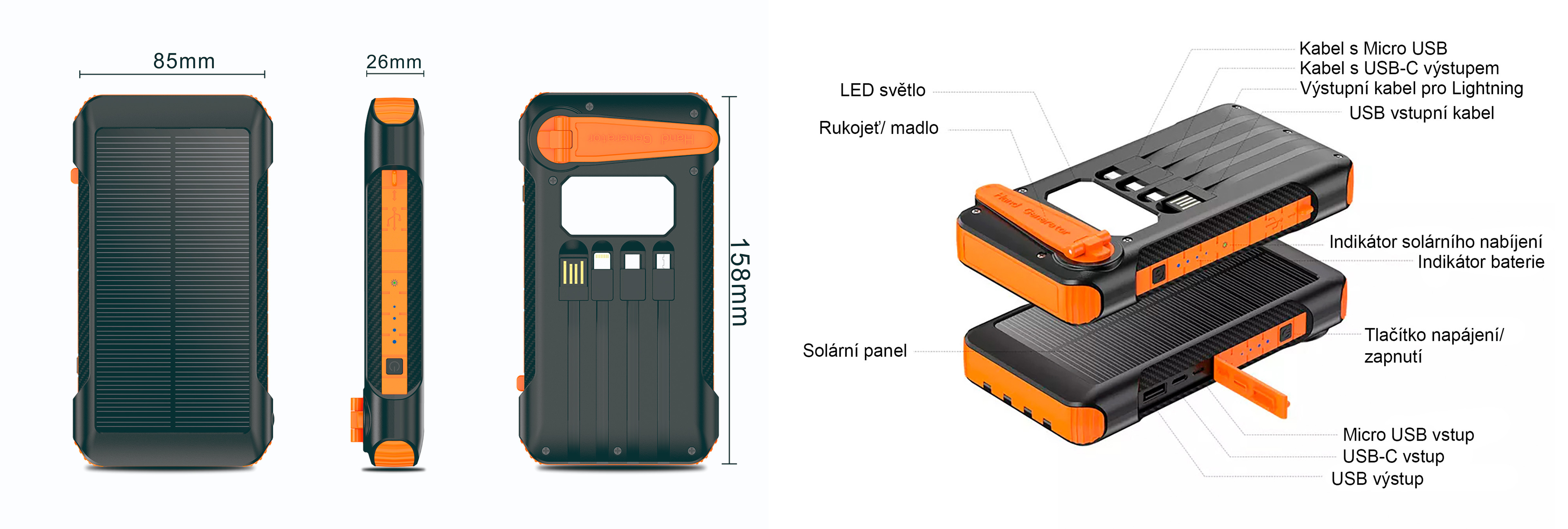 Nechybí výkonná LED svítilna s SOS režimem ani ochranné prvky proti zkratu, přebití či hlubokému vybití. Solární panel umožňuje průběžné dobíjení energií ze slunce, což oceníš zejména v přírodě a nouzových situacích. Díky více vstupům, široké kompatibilitě a robustnímu provedení je powerbanka spolehlivým doplňkem pro každodenní použití i delší outdoorové výpravy.