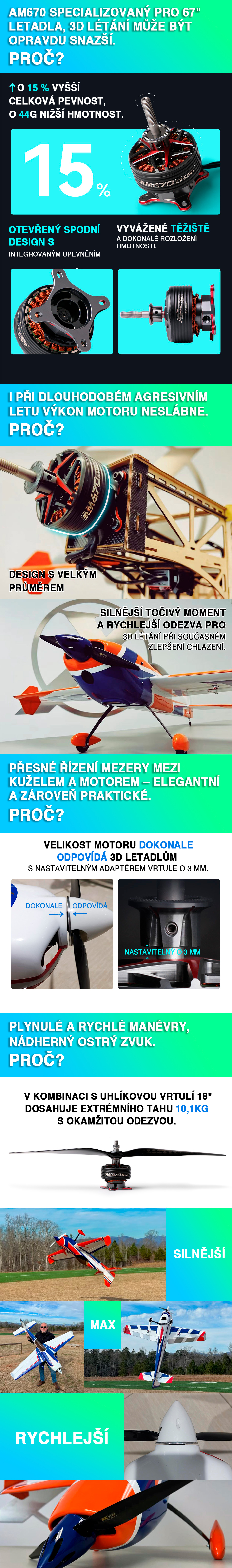 T-Motor AM670 je výkonný motor pro 3D modely v kategorii 67" s hmotností 4-5Kg. T-Motor AM670 je velmi kvalitně zpracován. Díky vlnkám na zvonku motoru a duté hřídeli, motor je robustnější a lehčí než jeho předchůdci.Poměr průměru a výšky motoru je 3:1 pro vyšší točivý moment a lepší chlazení.