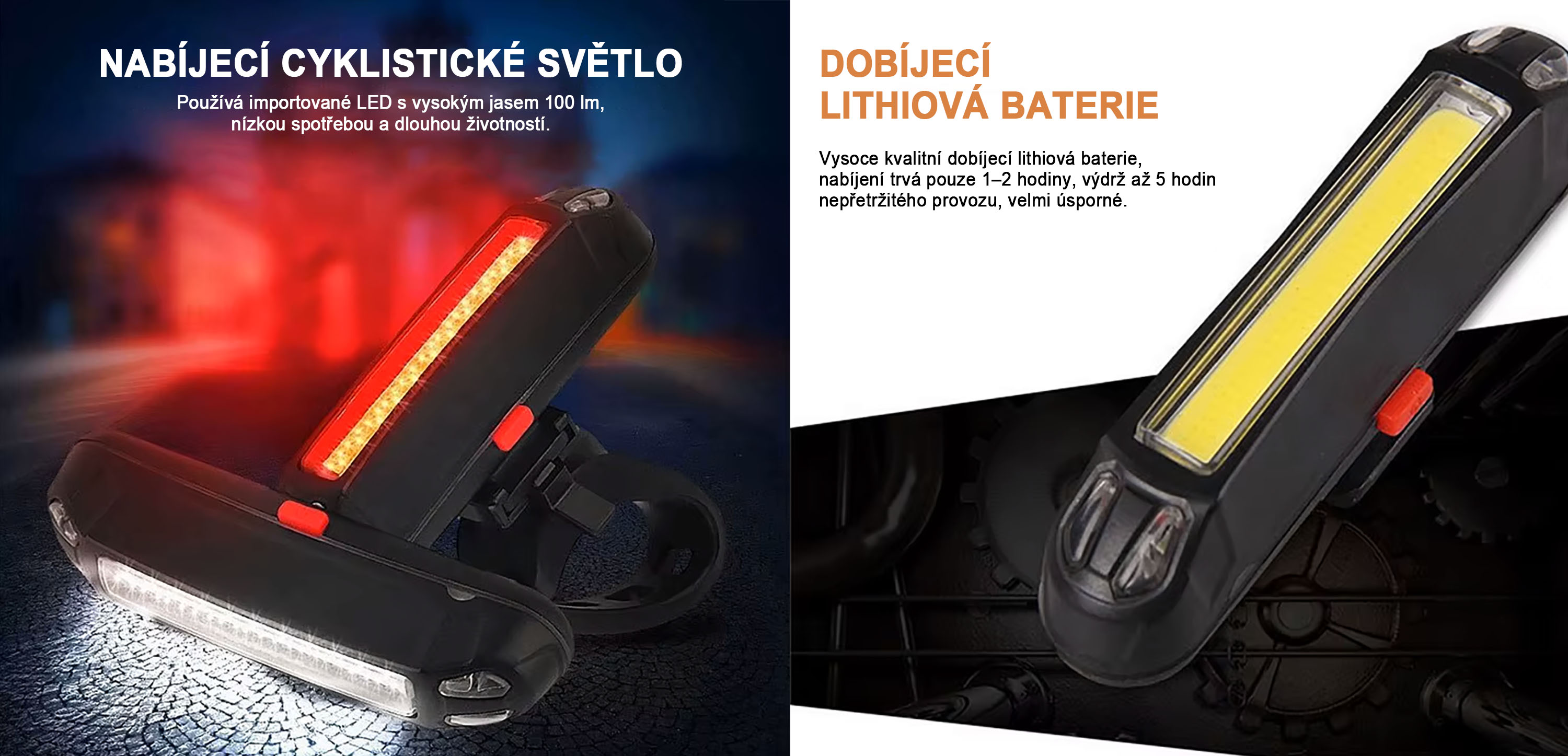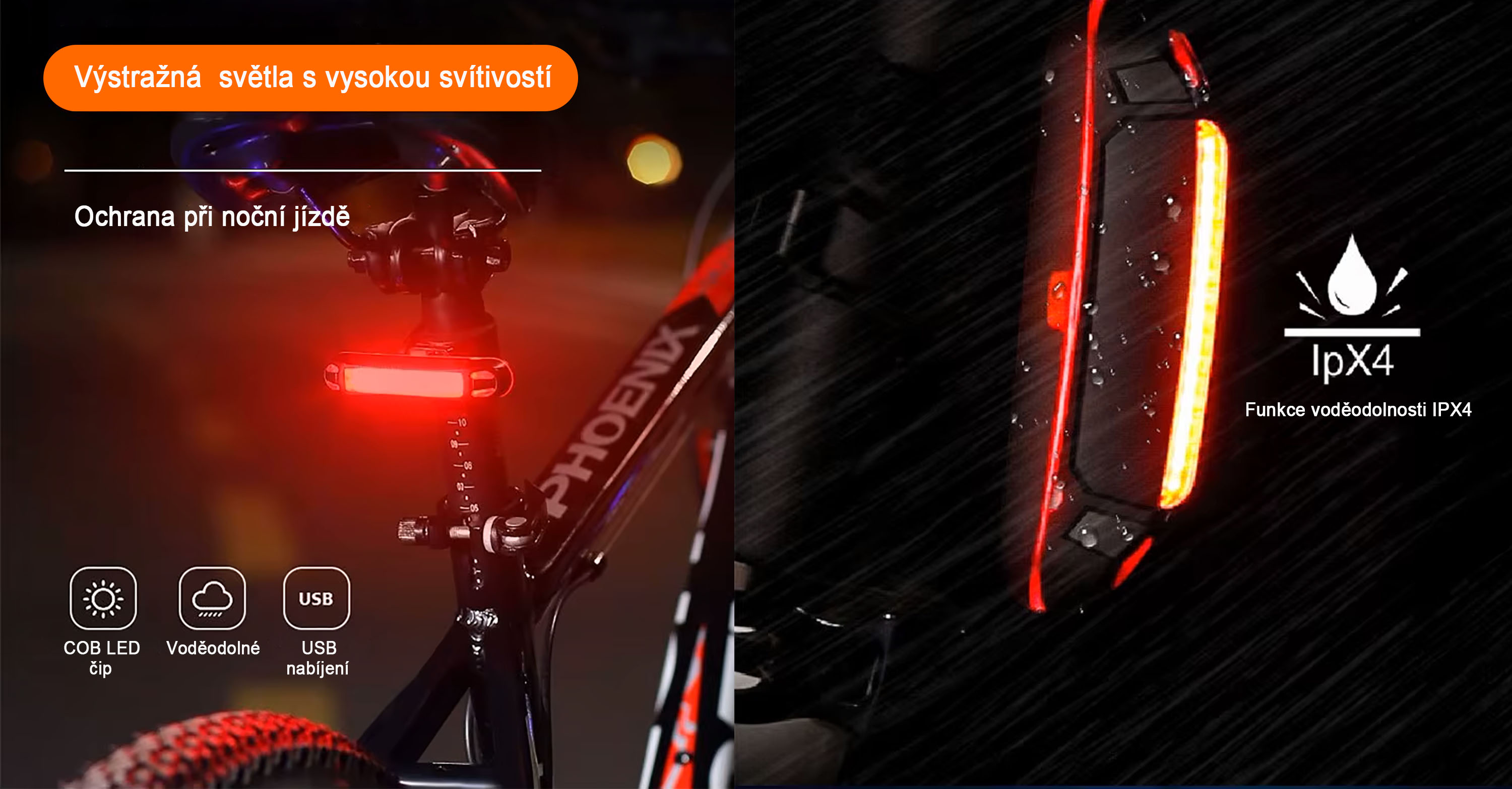 Světlo je navrženo jako výrazný bezpečnostní prvek pro noční provoz a zhoršené podmínky. Využívá COB LED technologii s výkonem až 100 lm, která zajišťuje vysokou viditelnost. Konstrukce splňuje stupeň krytí IPX4, takže odolá dešti i vlhkosti. Praktické USB nabíjení usnadňuje pravidelné používání bez nutnosti výměny baterií.