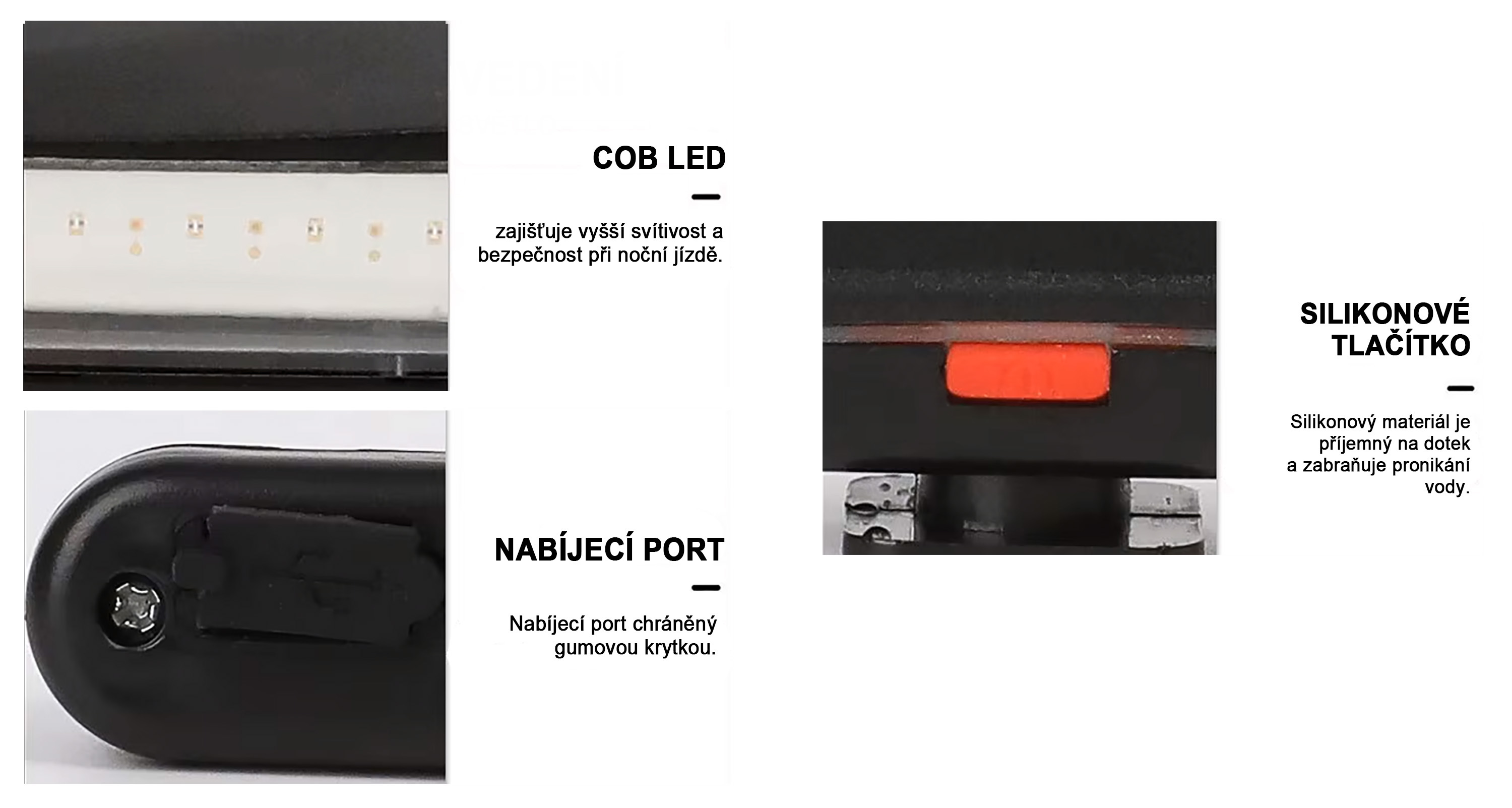 - Součástí balení je LED světlo KB-006, silikonový popruh a USB nabíjecí kabel.
