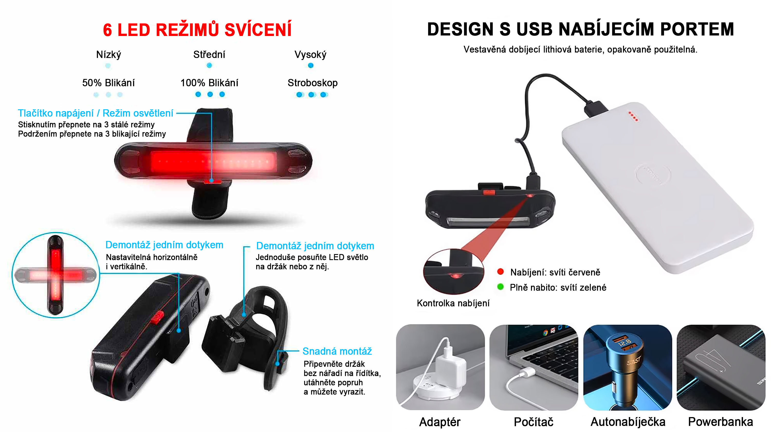 - Nabízí svítivost 100 lumenů a 6 režimů svícení pro různé podmínky jízdy.