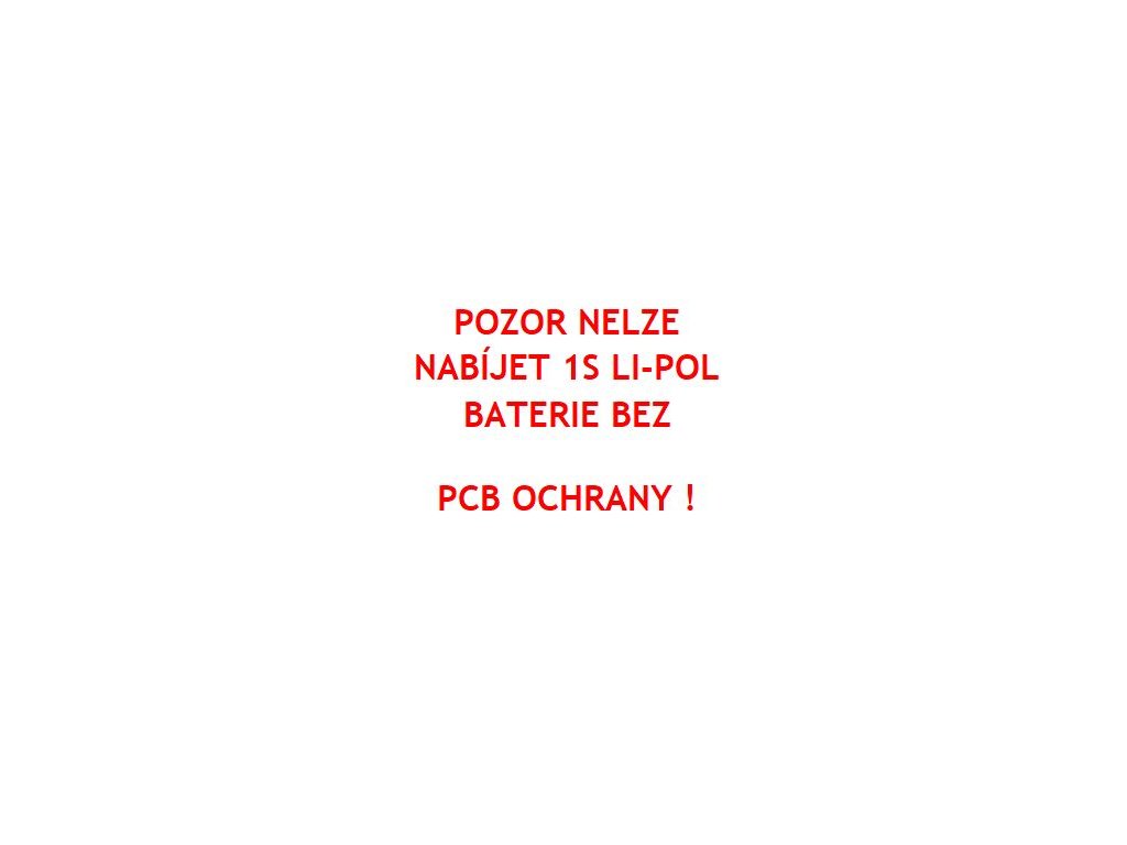 Pozor !!! lze nabíjet pouze lipo baterie s PCB ochranou proti přebití baterie. Naše lipo baterie 1S PCB ochranu nemají. V případě nabíjení baterie bez PCB ochrany může dojít k přebití baterie (nafouknutí) a možnému zahoření baterie !!!