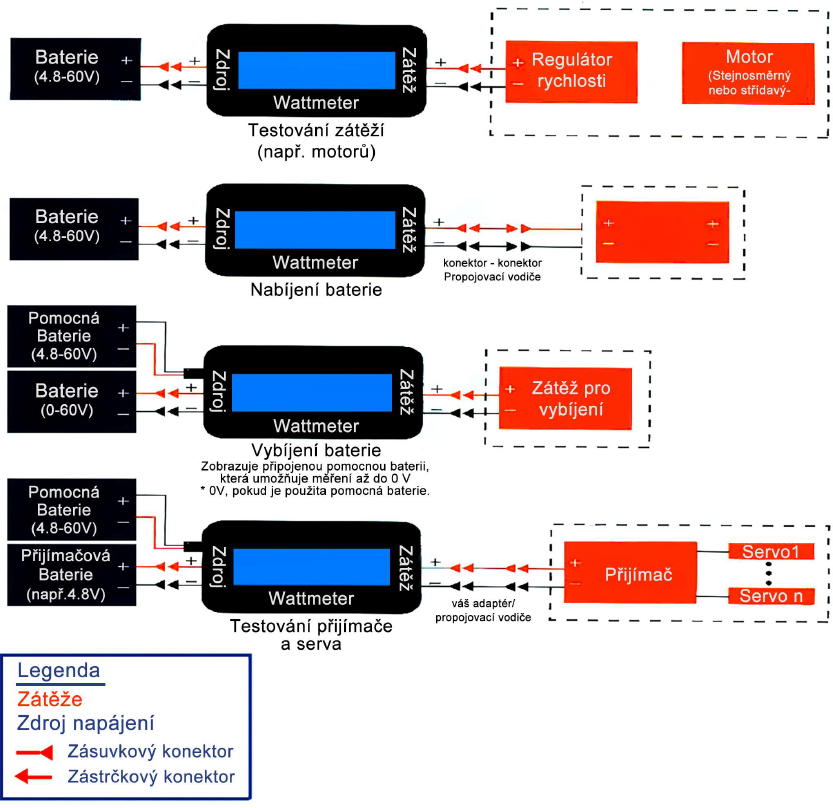 | Dokáže měřit příkon a proud, napětí, výkon, kapacitu, energii na připojených zařízeních - bateriích, regulátorech, motorech, servech, přijímačích, apod. |