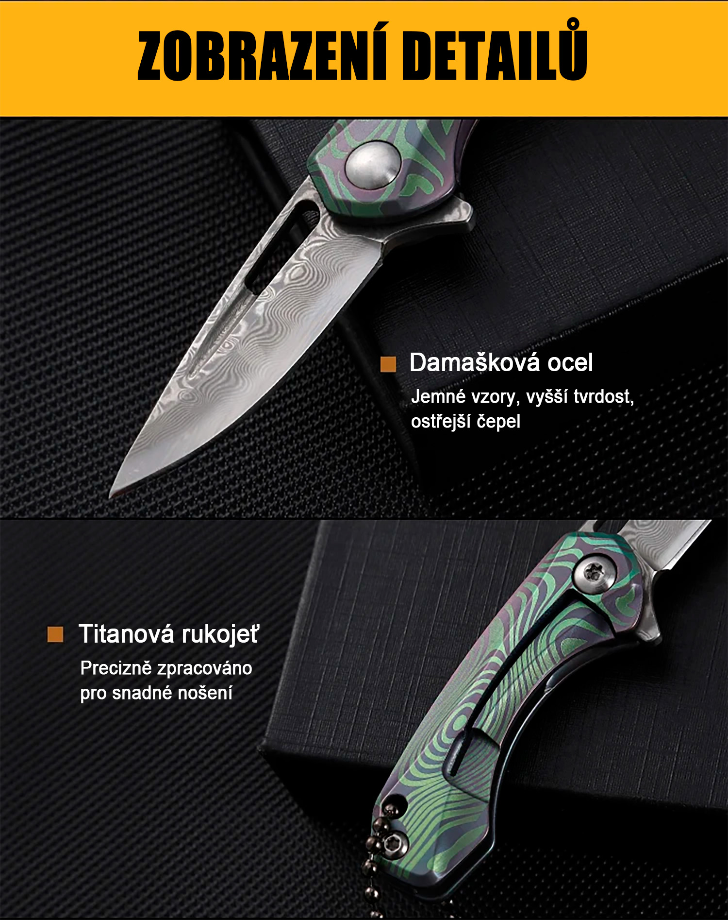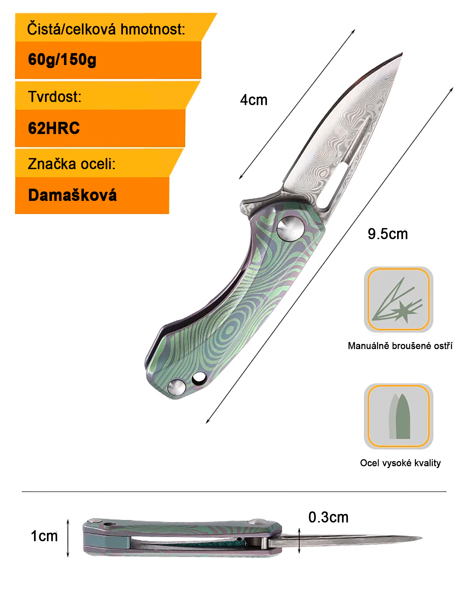 Díky své celkové délce 9,5 cm a čepeli o délce 4 cm je nůž ideální pro každodenní nošení, outdoorové aktivity, turistiku nebo jako elegantní malý dárek pro milovníky nožů.