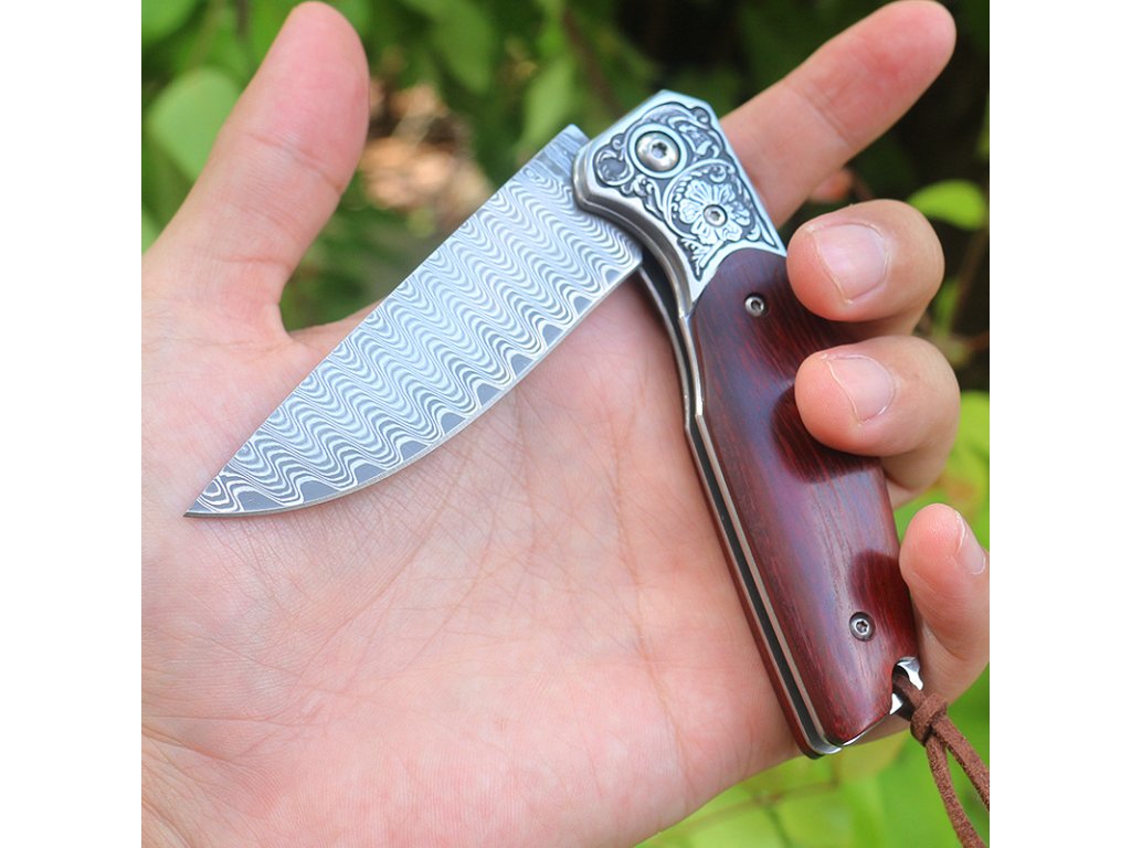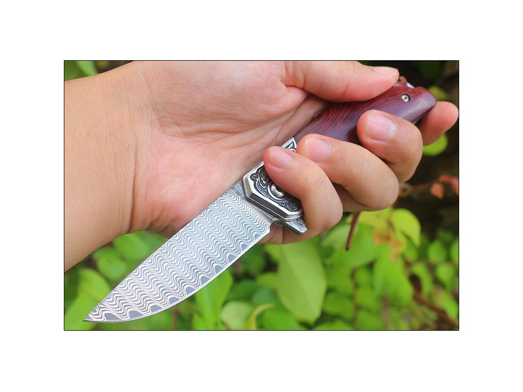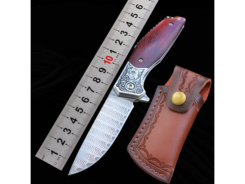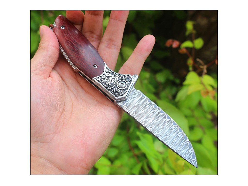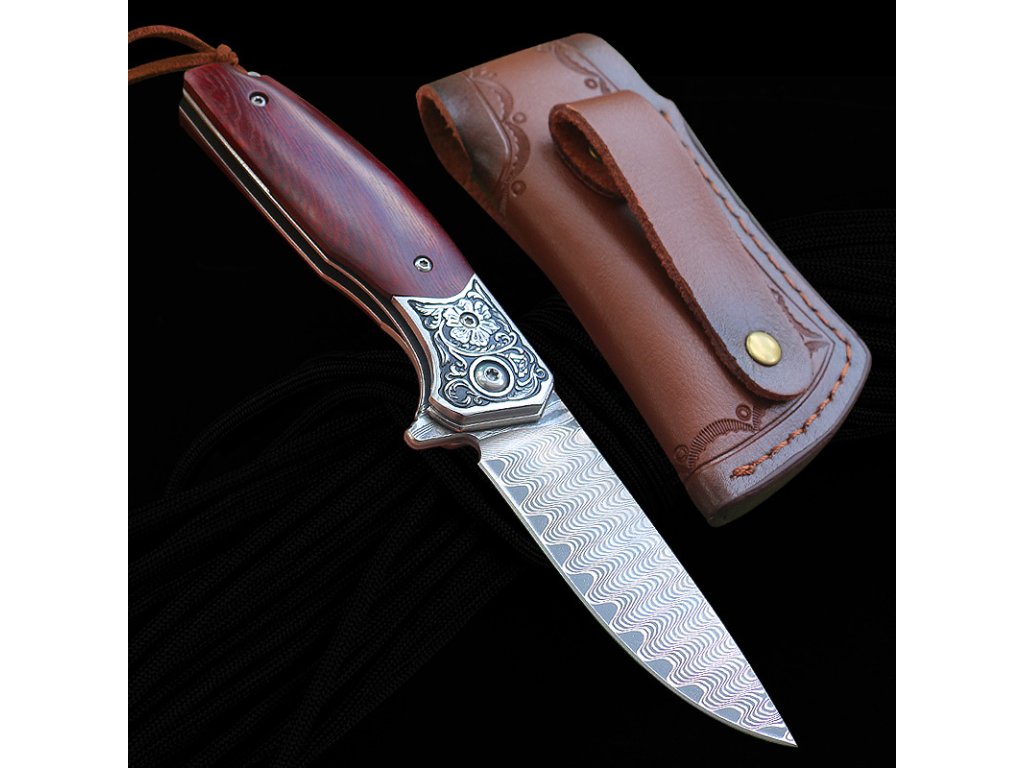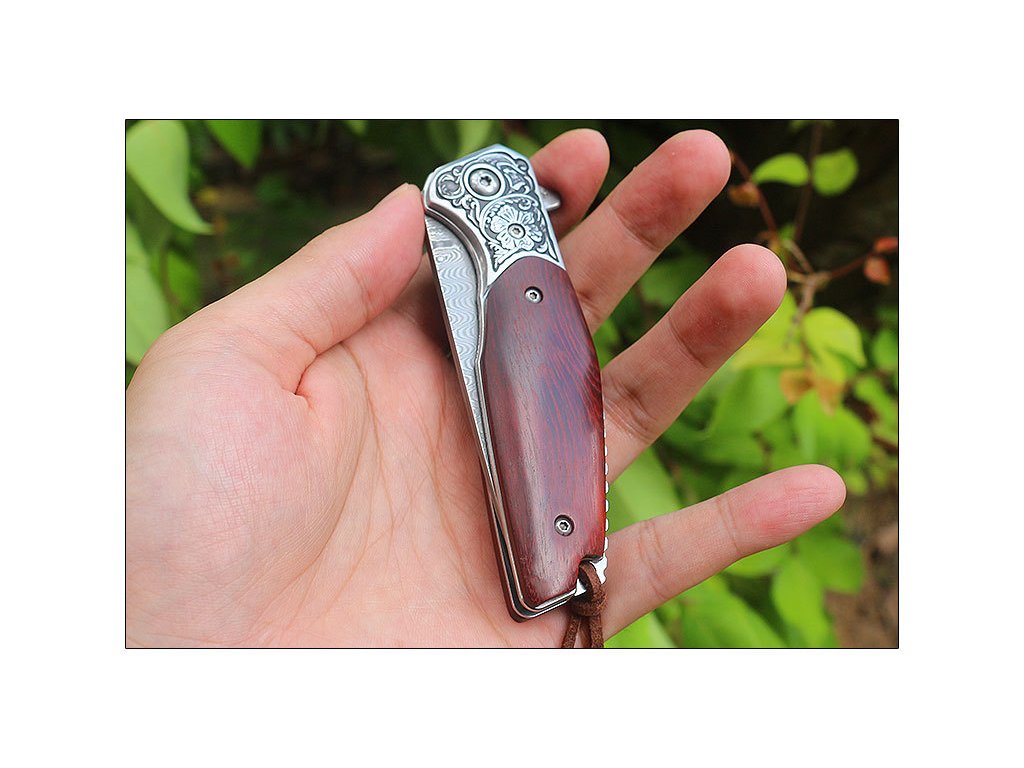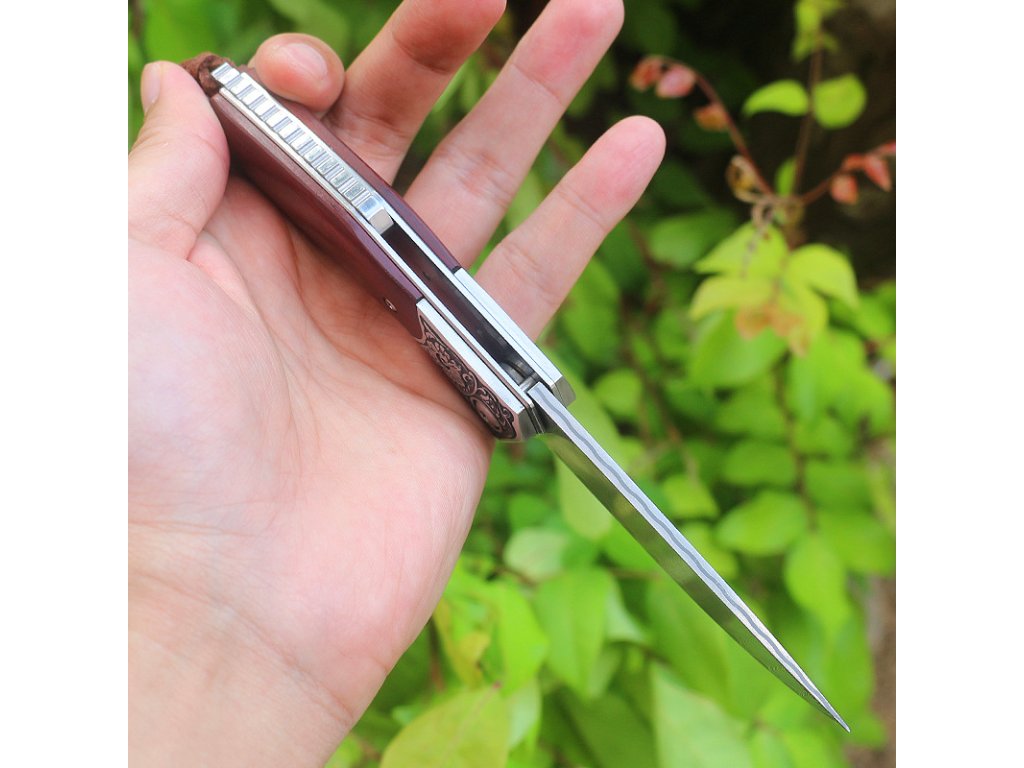 Tento skládací nůž s SKD-11 ocelí je ideální volbou pro lov, kempování a outdoorové aktivity. SKD-11 ocel je známá svou vysokou tvrdostí (60HRC) a ostrým řezem, který je ideální pro náročné úkoly. Rukojeť ze sandalového dřeva poskytuje pohodlný a stabilní úchop a dodává noži elegantní, přírodní vzhled.