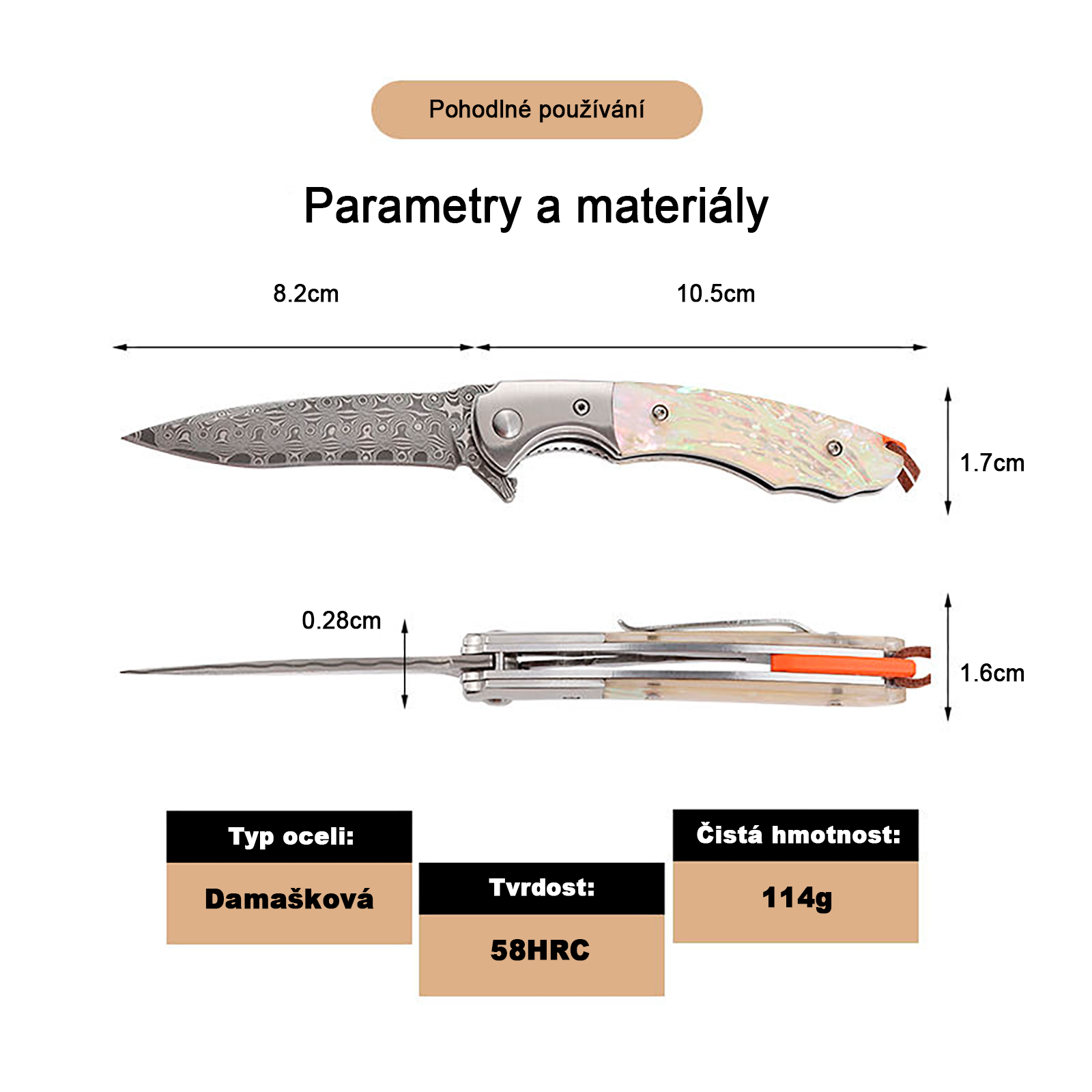 S celkovou délkou 18,7 cm a čepelí o délce 8,2 cm se jedná o ideální rozměr pro každodenní nošení, outdoorové aktivity, lov nebo práci v přírodě. Při hmotnosti pouhých 114 g je nůž lehký, snadno přenosný a perfektně vyvážený.