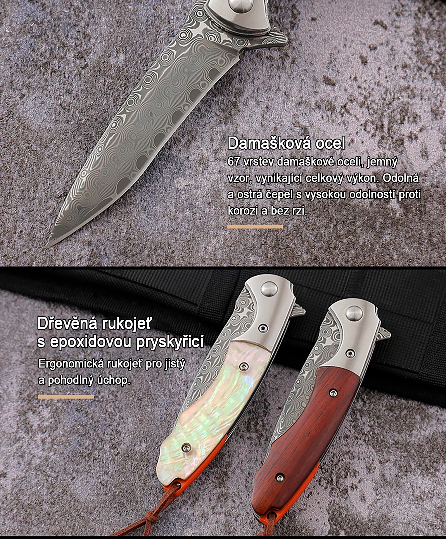 Čepel z damaškové oceli s tvrdostí 58 HRC poskytuje vynikající ostrost, pevnost a odolnost proti opotřebení. Damaškový vzor na čepeli dodává noži prémiový vzhled a z každého kusu činí originální nástroj.