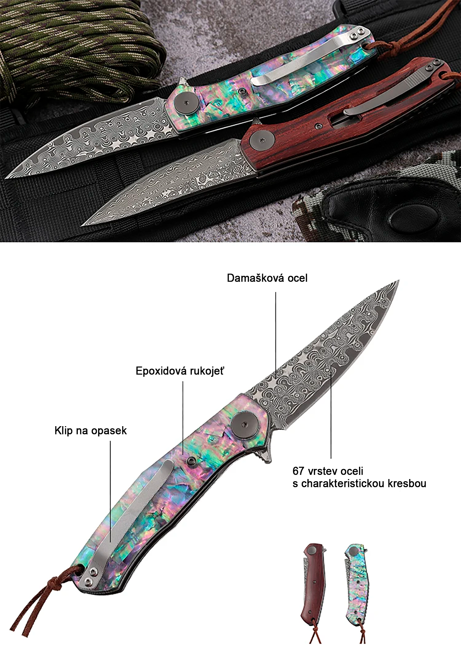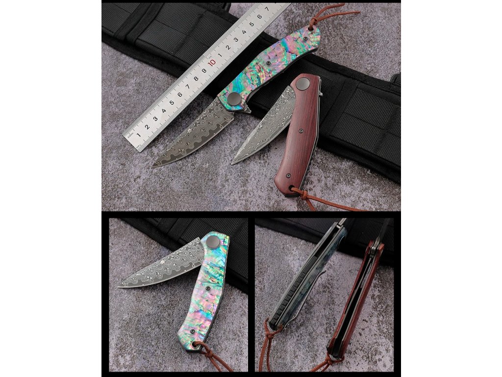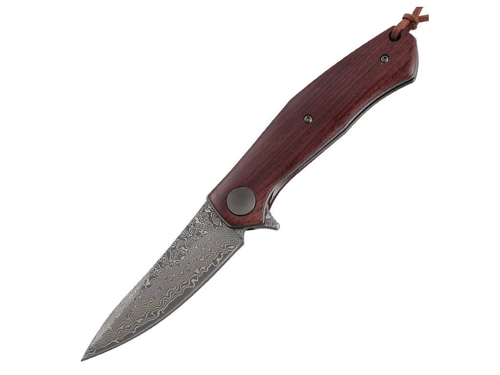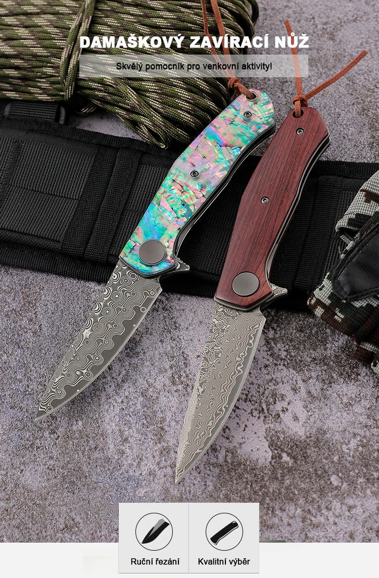 Kempingový skládací nůž z damaškové oceli s dřevěnou rukojetí