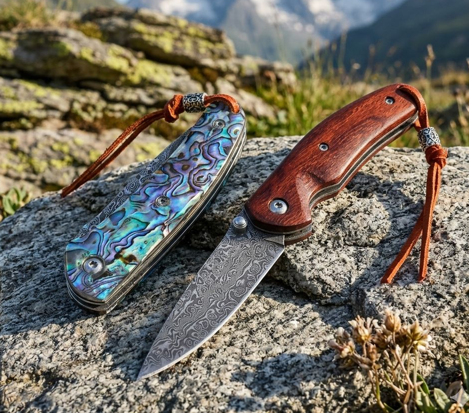 Skládací nůž s damaškovou čepelí a rukojetí z červeného dřeva