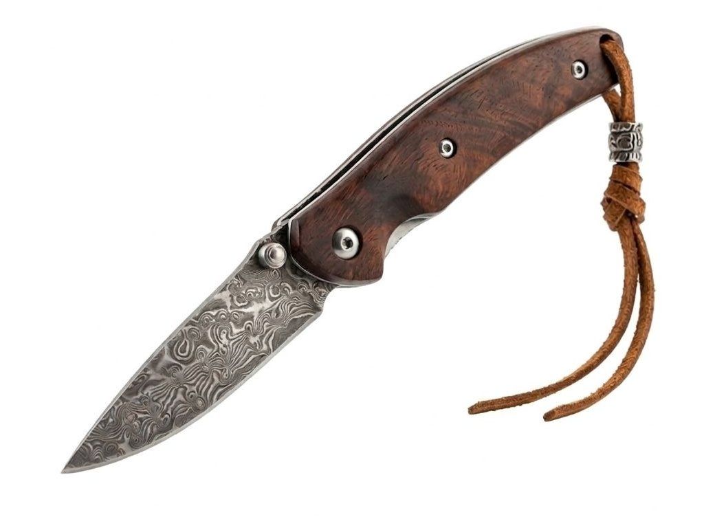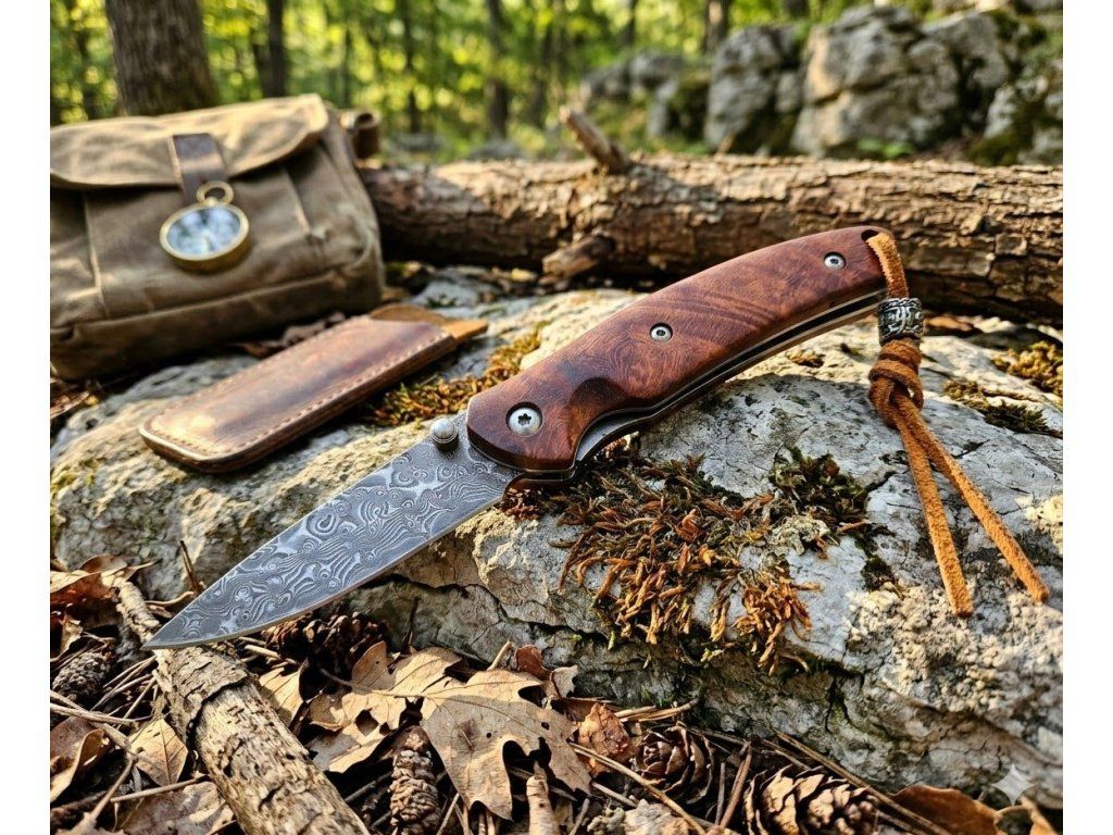 Skládací nůž s damaškovou čepelí a rukojetí z červeného dřeva